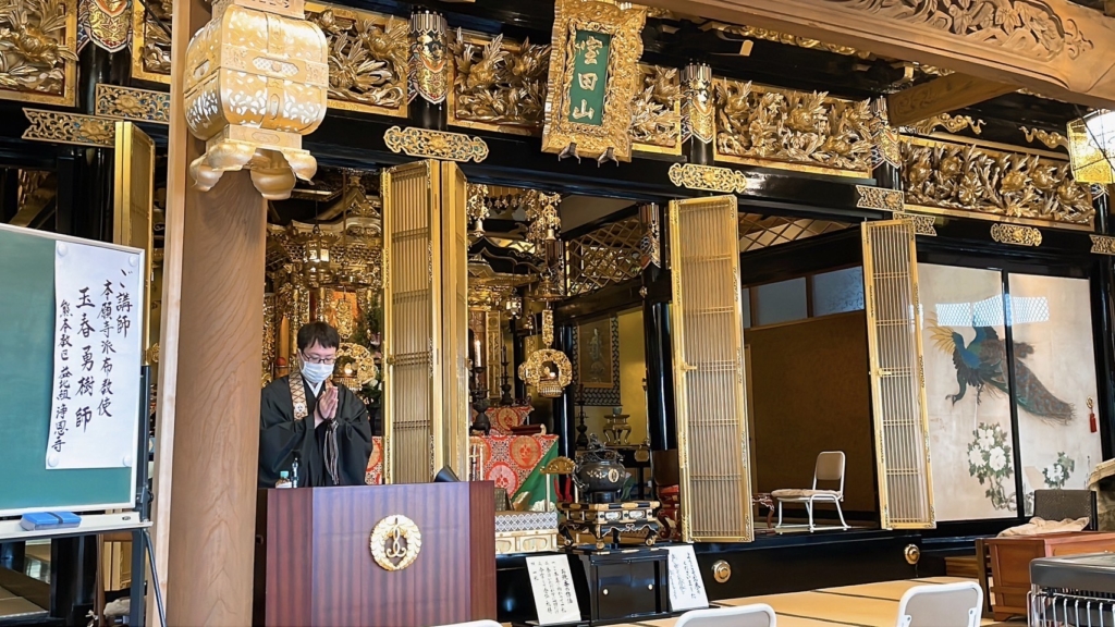 ご講師の玉春先生は副住職(若院)の京都の仏教学院(僧侶専門学校)時代の年齢は先輩ですが、僧侶としては同期であります。そのようなご縁から今年は玉春先生にきていただきました。7年前に熊本を襲った熊本地震で大きな被害を出した益城町にお寺があり、その当時どんなに大変な日々の中でもお寺にお参り来られるご門徒の後ろ姿や様々な経験から、どこか心がホッとあたたかくなるような時間でありました。