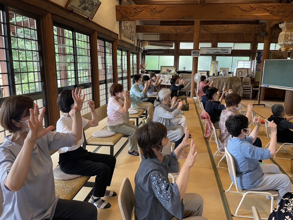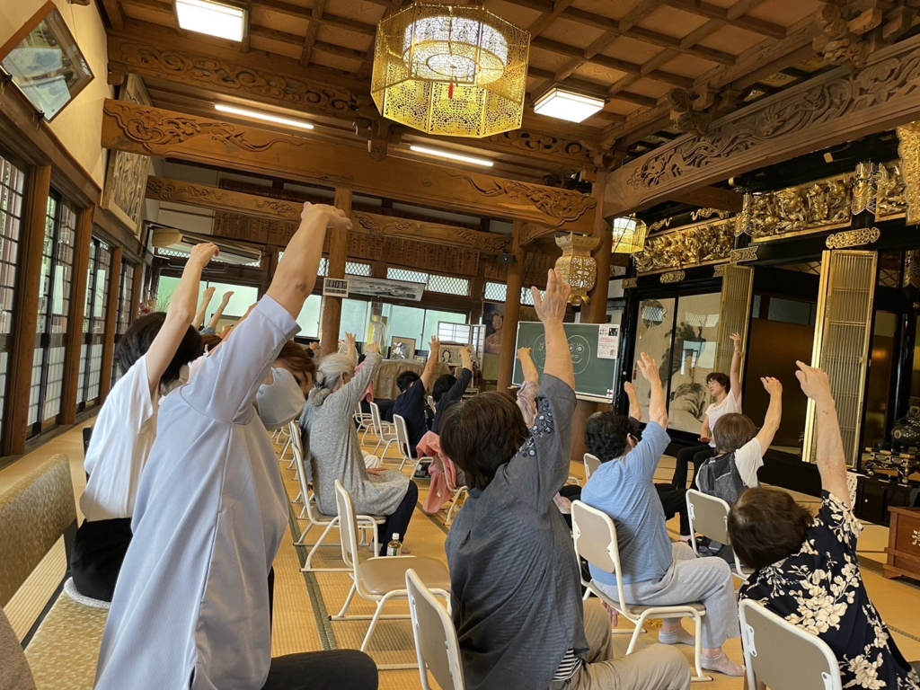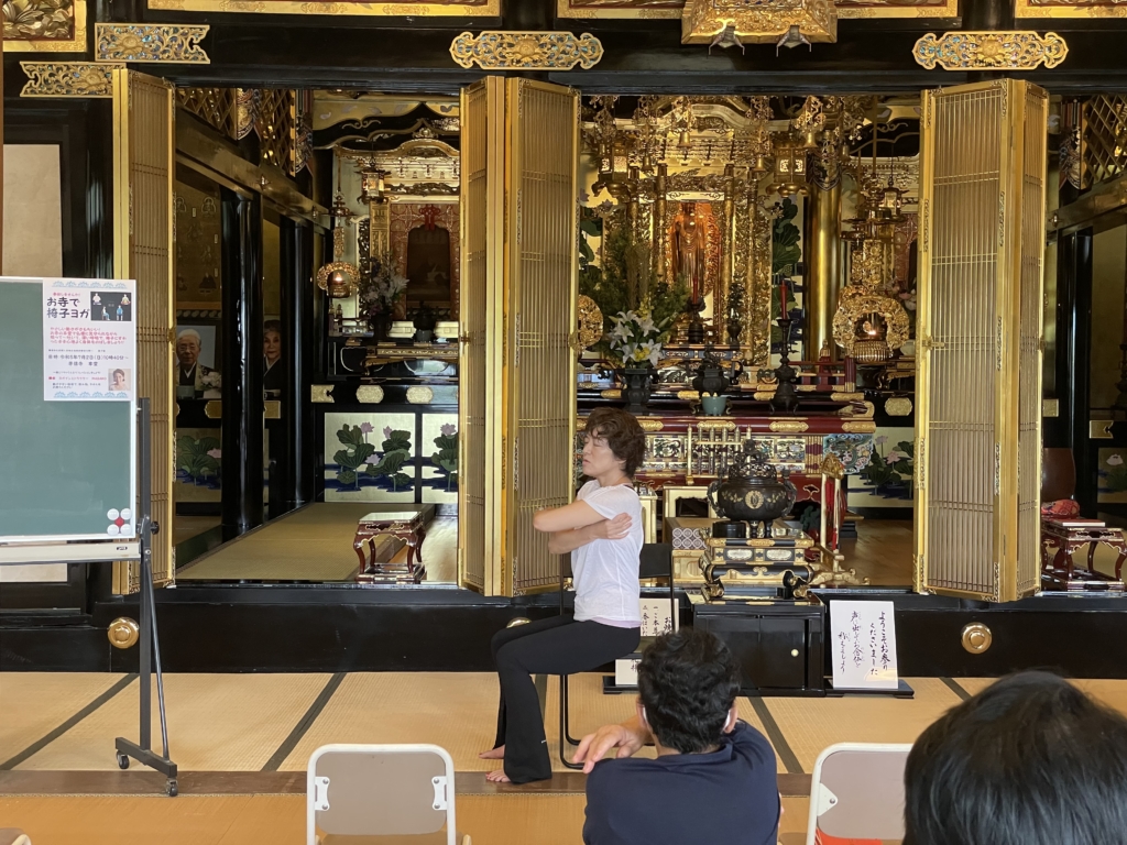 今回は専徳寺で初めてのヨガ教室でもあり、参加者も高齢の方も多いため、今回は椅子に座ったままでもできるヨガとして椅子ヨガのプログラムにて開催しました。