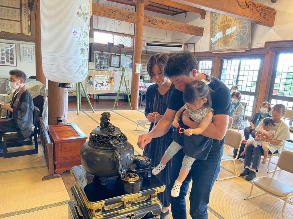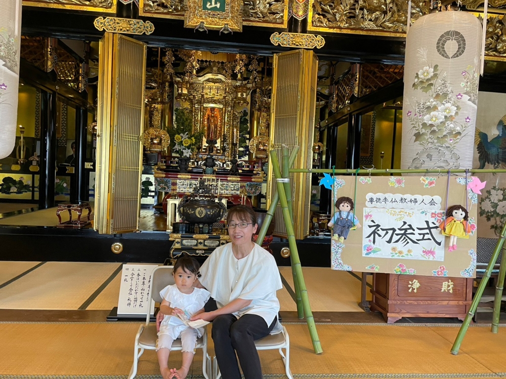 去年まではコロナ禍もあり、子供さんの参加も少なかったですが、今年は5名の子供さんにご兄弟や専徳寺の副住職の息子も参加し、今年は賑やか初参式となりました。ゲスト出演の副住職の息子は自分が主役とばかりに最前列でしっかりと手を合わせておりました(笑)