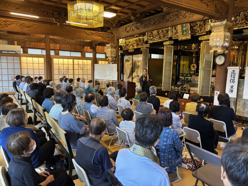 たくさんの門信徒の方々がお参りくださり満堂の中、先生のお話しに笑顔溢れ、一緒に大きな声でお念仏申す、そんなあたたかい時間でありました。有難いことに、また大道先生のお話しを聴きたいと言ってくださる方も多く、先生にまた是非お願いしますとお約束させていただきました。