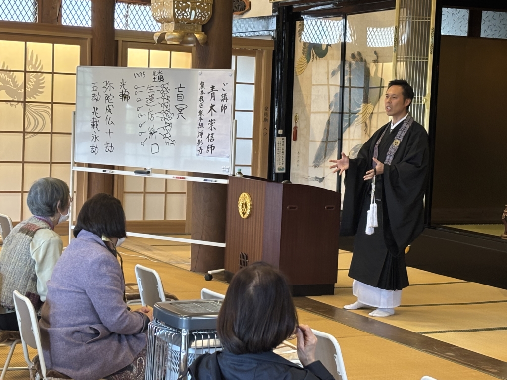 ご講師には 熊本教区熊本組 浄影寺のご住職 青木崇信先生にお越しいただきました。青木先生には専徳寺仏教婦人会の花まつりやお彼岸などで約8年前に来ていただいており、現在は副住職と至心会(若手僧侶の会)の先輩としてもお世話になっており、そんなご縁から久しぶりの専徳寺の法要に来ていただきました。