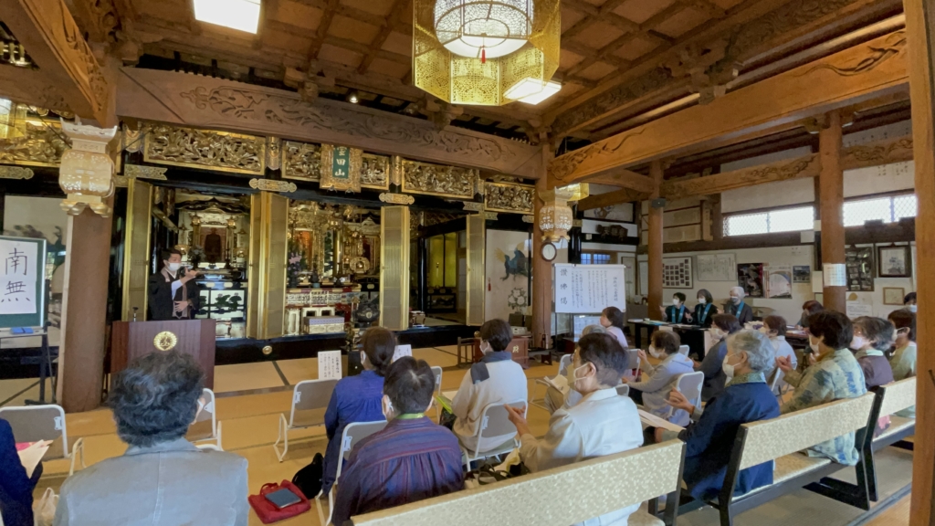 仏教婦人会の花まつりはコロナ禍のため中止が続いておりましたが、2年ぶりに開催することができました。久しぶりの仏教婦人会の活動でもあり、お寺に来て本堂で合掌し、お経を拝読し、お念仏申す、その姿をみて今まで当たり前であったことも当たり前ではなく有難いことであったのだと改めて気づかされました。この有難い花まつりのご縁に今年は副住職(若院)がお取次ぎ(法話)させていただきました。